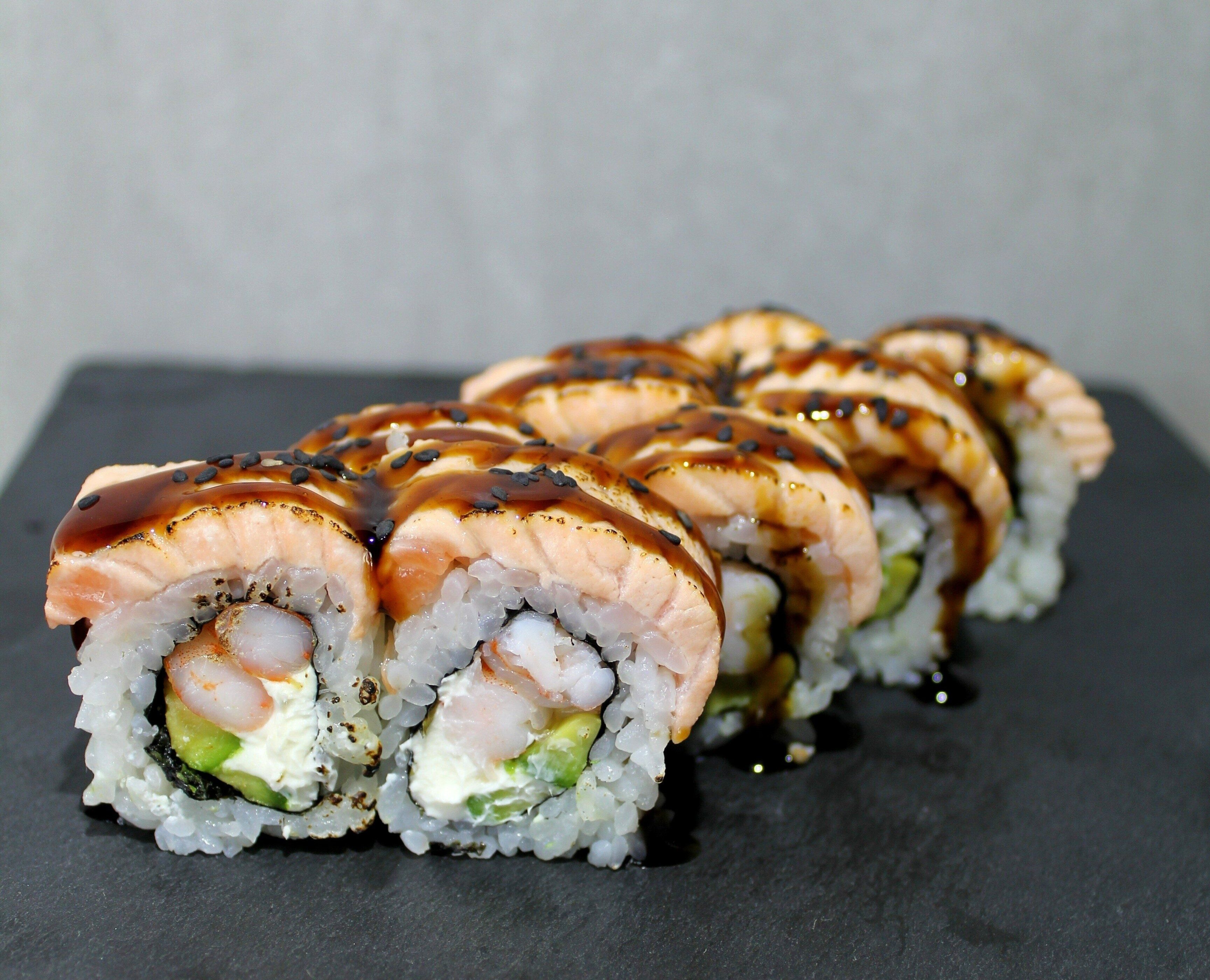 Lasis, tīģergarneles, avokado, krēmsiers, terijaki mērce, sezama sēklas