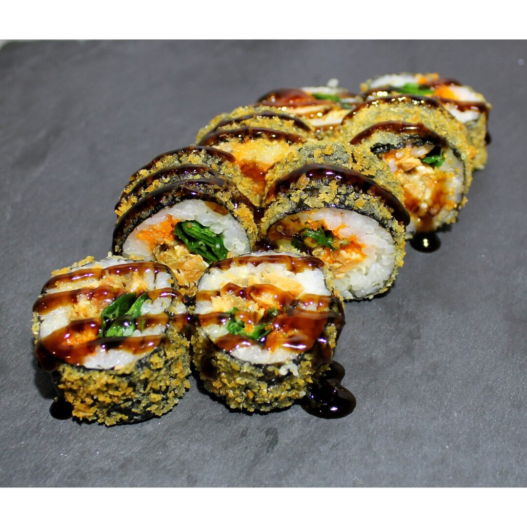 Cepts lasis, masago ikri, spināti, asā mērce, terijaki mērce, tempura-Panko