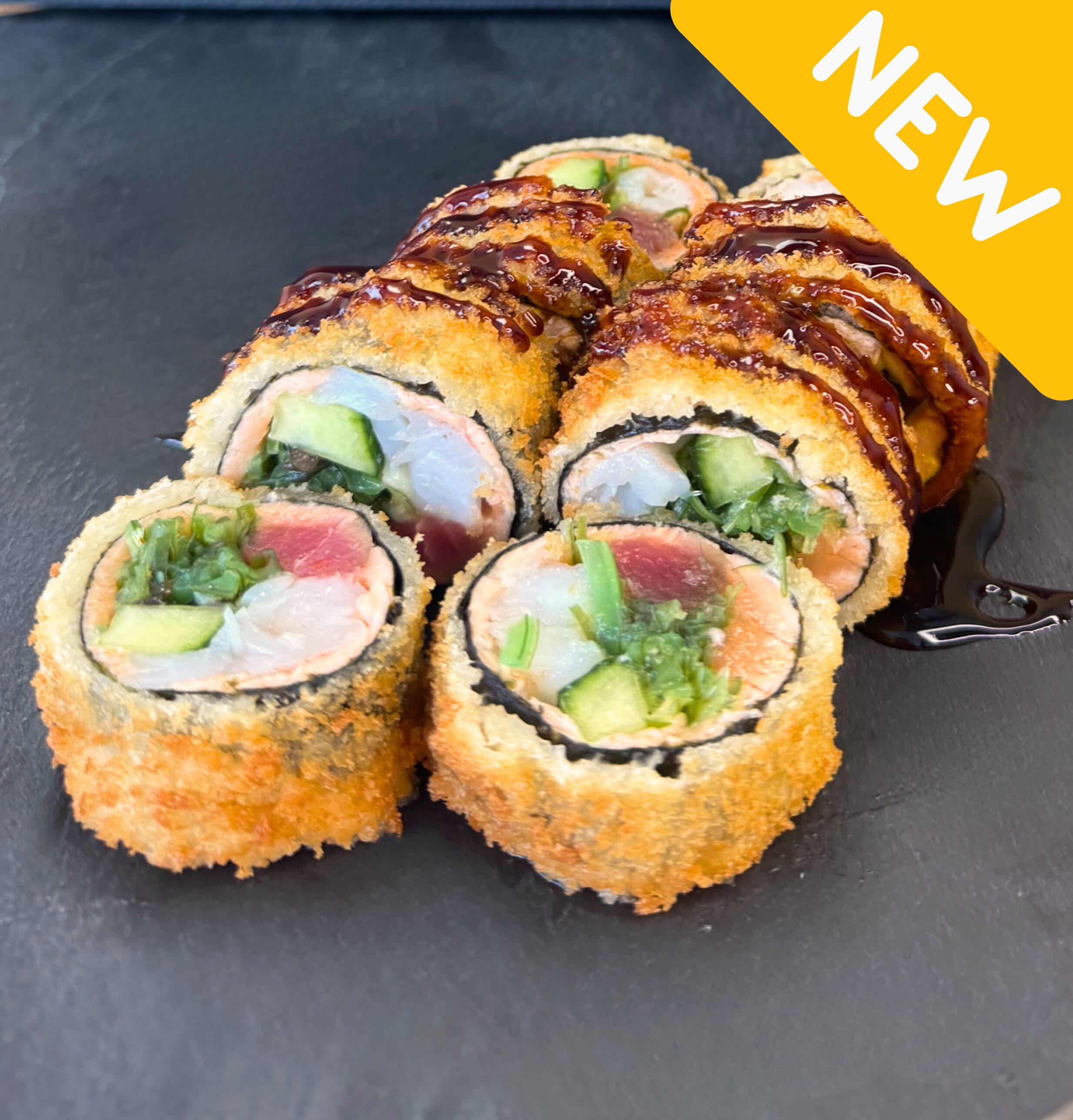 Lasis, tīģergarneles, tuncis, gurķis, jūraszāles – wakame, tempura – panko, terijaki mērce.